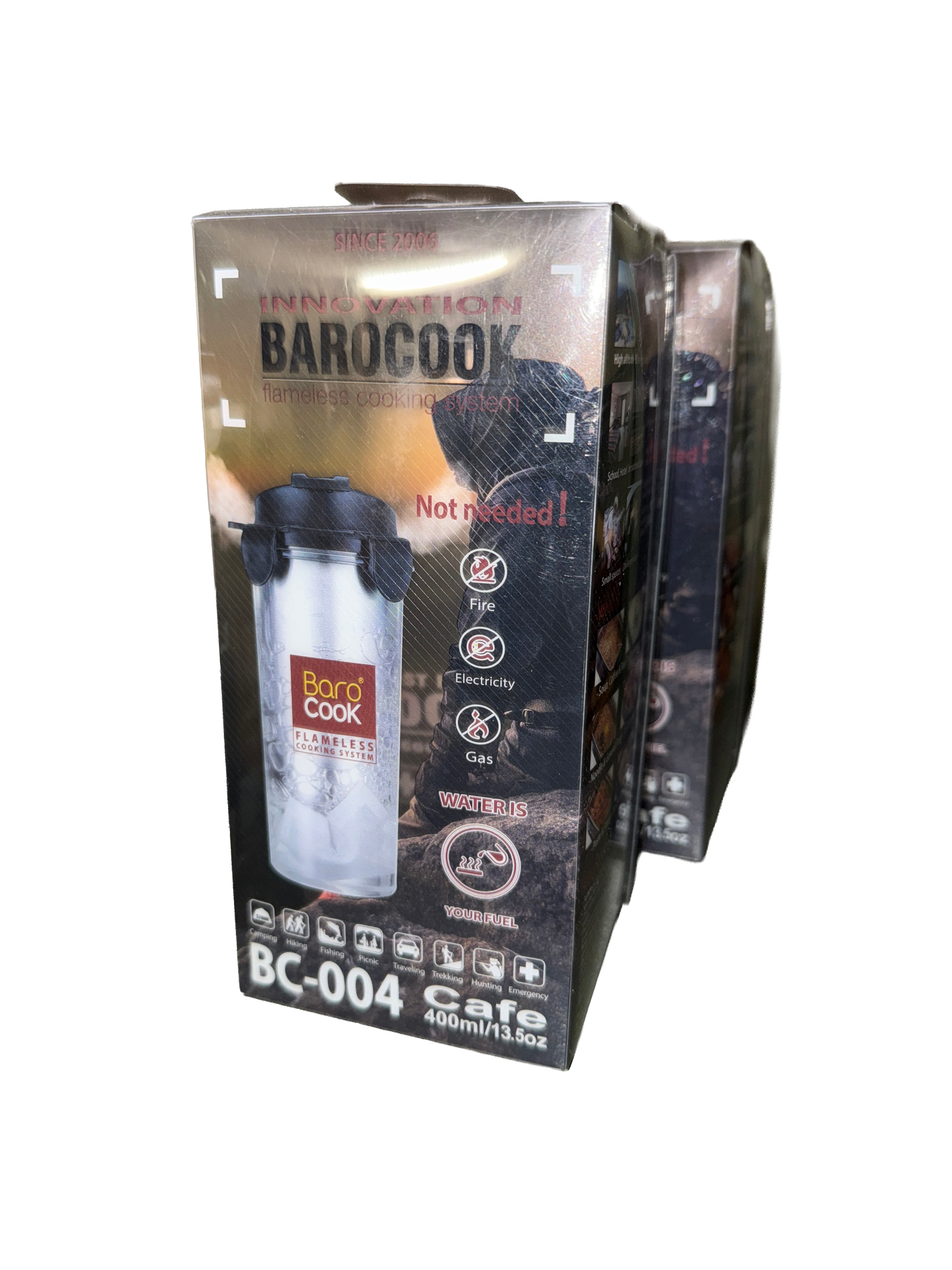Barocook Mug är en del av BaroCooks patenterade flamlösa koksystem som värmer drycker och lagar mat. Denna revolutionerande teknik gör det möjligt att värma drycker eller laga mat utan eld eller el.